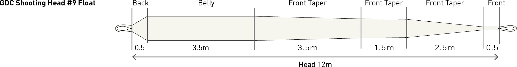 GDC shooting heads have been developed specifically for modern double-handed fly casting techniques. Available in a range of densities from full floating to extra fast sinking, each head is looped at both ends and is easily identified by a lazer inscription denoting its size and class. The head configuration is designed to enhance efficient energy transfer during the casting cycle by maintaining a tight, aerodynamic LOOP profile on the forward delivery. This dynamic profile focuses forward energy towards the target, resulting in highly effective fly presentation at a range of distances.
