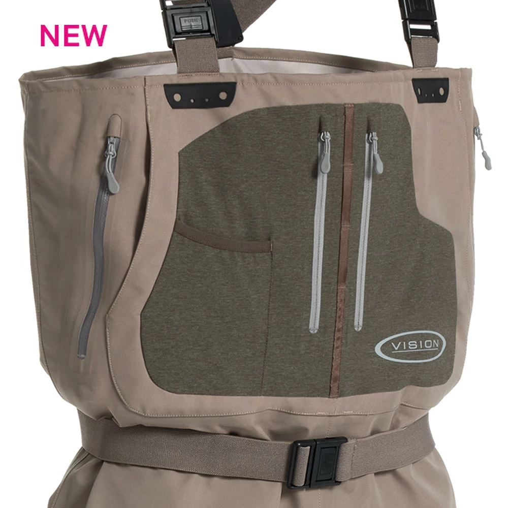 Vision Tool kahluuhousut sisältää monia taskuja sekä tarkkaan suunniteltuja yksityiskohtia erilaisille tarvikkeille. Näissä housuissa on monikerroksinen joustava rintatasku jossa myös käsienlämmittelytaskut. Päällimmäisenä on kaksi taskua jotka on varustettu pystysuuntaisella vetoketjulla. Vetoketjujen väliin on sijoitettu lenkkinauha johon saat kiinnitettyä monenlaisia tarvikkeita. Oikean taskun päällä on avoin rintatasku johon saa kätevästi pistettyä roikkuvat työkalut.