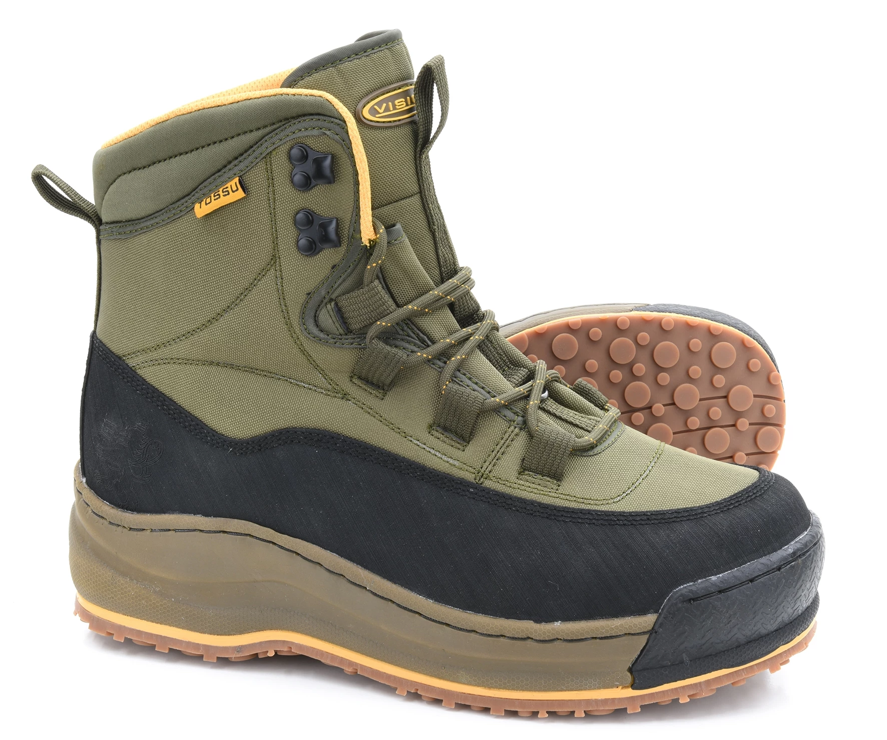 Vision Tossu kahluukengät tarjoavat erittäin hyvän tuen jalalle kaikissa tilanteissa. Kenkien kulutussuojukset pohjien yläpuolella on vaihdettu kumista PVC:hen, jotta tikkaukset on mahdollista upottaa ja saada paremmin suojaan. Uniikki valettu EVA välipohja on mukava jalalle ja paranneltu Gummi kumipohja tarjoaa entistä paremman pidon. Tossu kahluukenkien ylä- ja alaosat on kiinnitetty sekä tikkaamalla että liimaamalla toisinsaa, jolloin saadaan nilkkaa tukeva ja erittäin hyvin kestävä rakenne. Kenkien etuosan puskuri pehmentää osumia kiviin ja parantaa kenkien kulutuskestoa. Gummi kumipohjan rakenteen ansiosta siihen on hyvä ja turvallinen kiinnittää halutessasi Vision Tungsten Stud nastat, jotka myydään erikseen.
